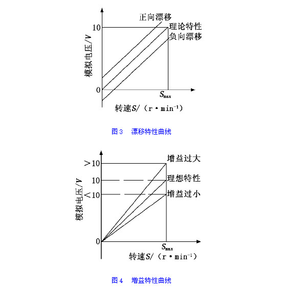 模拟量(liàng)輸出的(de)漂移特(te)性曲線(xian)如圖3所(suǒ)示,調整(zhěng)漂移參(cān)數🚶可改(gǎi)變轉速(sù)S0所對應(ying)的電壓(ya)輸出值(zhí),使特性(xìng)曲✉️線上(shàng)下平移(yí)。本例中(zhōng)🐕漂移♍參(cān)數設定(dìng)為0時,實(shi)測S0轉速(su)對應電(dian)壓為-0.048V,特(te)性曲線(xiàn)為負向(xiàng)漂移曲(qǔ)線。經計(jì)算和🍉設(she)定漂移(yi)參數後(hou),再💃🏻次實(shi)測漂移(yi)電壓為(wei)-0.002V,基本接(jiē)近🛀🏻于0V,特(te)性曲線(xiàn)⛱️基本接(jiē)近理🐪想(xiang)特性曲(qu)線。
